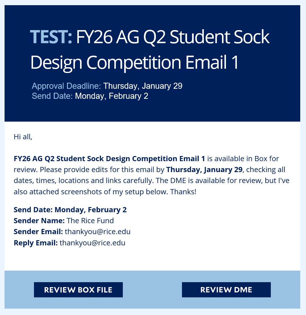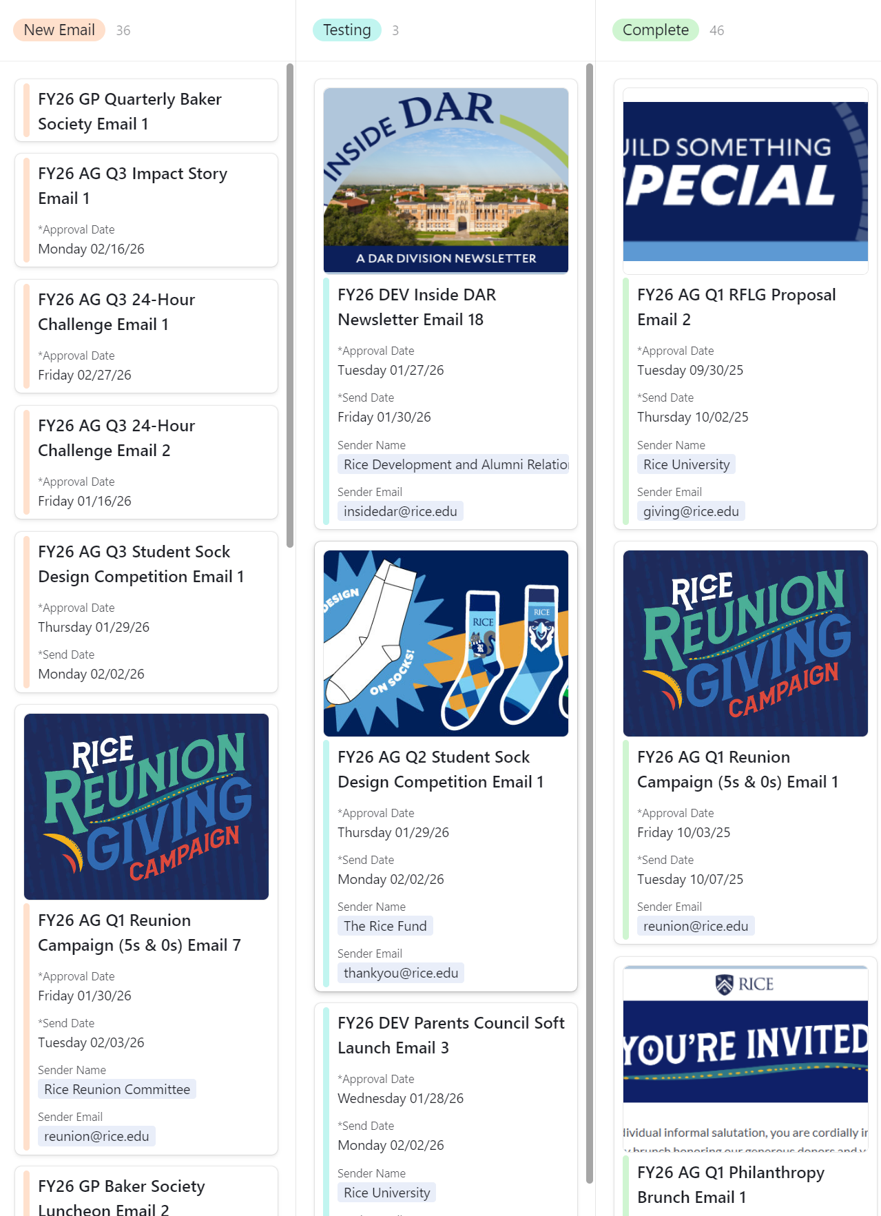 I manage the approval lifecycle of email campaigns, coordinating reviews across writers, cross-functional stakeholders, and leadership to ensure accuracy, compliance, and consistency before launch. In parallel, I set up direct marketing efforts in our Blackbaud CRM, assigning email variants to the appropriate audience segments, often based on giving history and engagement data.