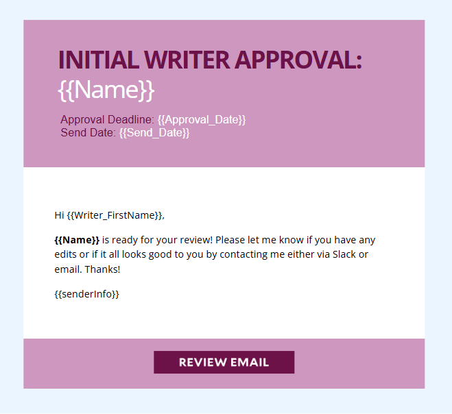 Underneath the email details are the approver roles. The approvers’ (editorial, content and final) names are also dynamically pulled in and matched to their correct approver role.