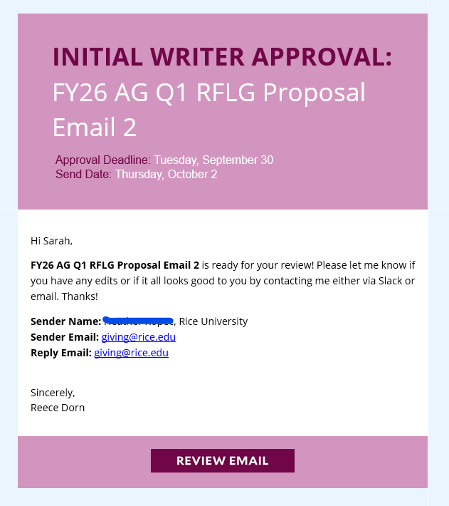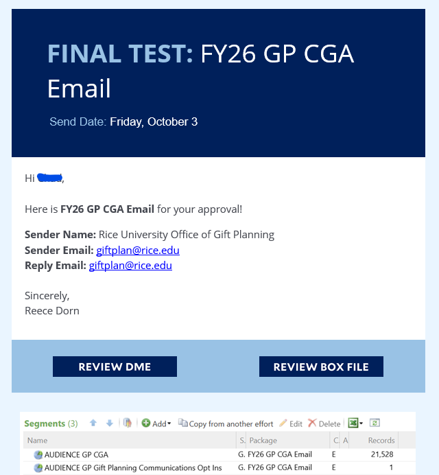 First phase of testing. After DCS creates the emails in Beefree and the DME in our OwlConnect email system, the Box link and corresponding email information can be sent to the writer for an initial approval. This first phase is intended to catch small mistakes in the copy or sender information and ensure the writer’s (and potentially the designer’s) vision for the email is captured.