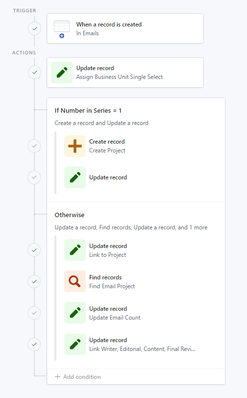 New email records are automatically created in Airtable whenever a “Build Email” task in Teamwork is detected. This specific task acts as the trigger for identifying a new email and starting the record creation process, pulling in all associated project and email information from Teamwork to my Airtable database. No manual entry is required by the Digital Content Specialist.