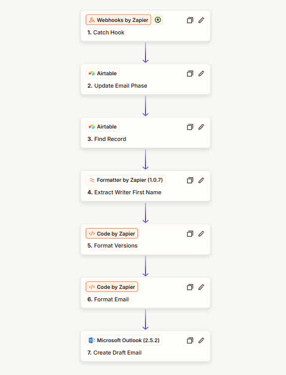 Once the email is ready for an Initial Writer Approval, it can begin the first phase of the official testing process. Each Email record has its own set of testing buttons that trigger different types of testing emails depending on the email phase it’s currently in, utilizing Zapier webhooks.
