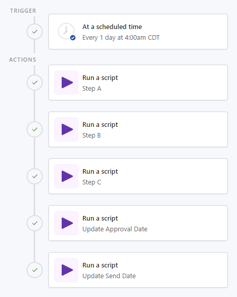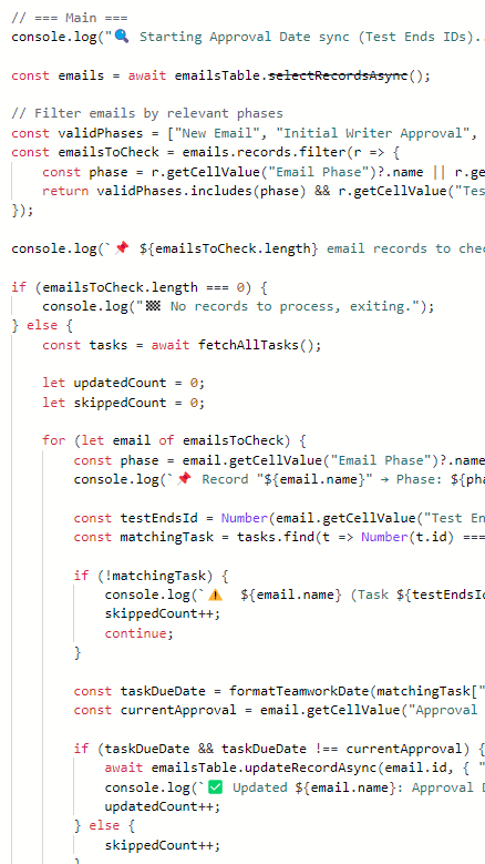 The script first only identifies emails in the table that are in either Build email, Test ends or Send email tasks assigned to me. This prevents any unnecessary API fetch requests, as Airtable has a 50-request fetch limit per script run. Next, the script searches for all the “Test ends” tasks connected to my current Emails via their Test Ends ID. If the due date of the Teamwork task is different than the Approval Date in Airtable, the script replaces the Airtable date with the Teamwork date. A second updater script is then run that does the exact same thing as the first, except it looks for Send email tasks via the Send Email ID and updates the Send Date if there’s a date mismatch.