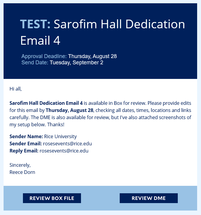 Reminders emails are usually emails that are after an initial invitation for an event. They have the exact same copy as the previous email in that project’s email series, but is sent as a “Reminder” or “Final Reminder” to those from the first email’s audience who have not registered yet. The testing email that gets sent down this path just reflects this information, as no action is needed, but links to the DME and the Box file of the invitation are still available.