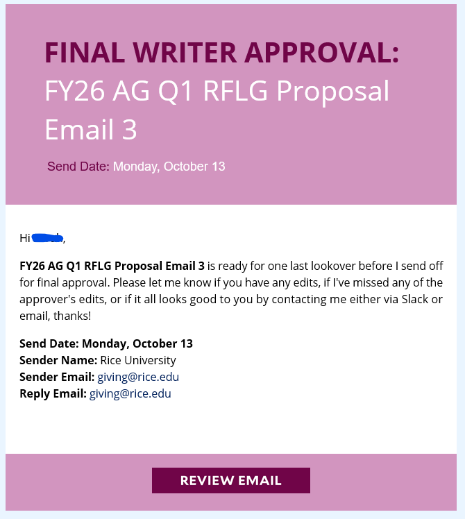 {Email Phase} is updated to “Final Writer Approval” and is then moved into that category in the interface.